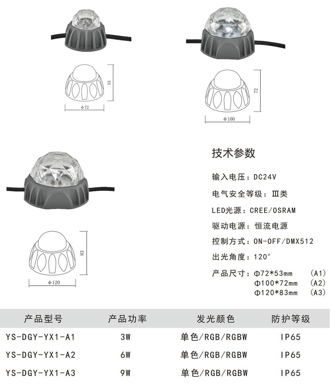 ◆灯具控制方式:单色常亮效果(红、绿、蓝、黄、白、暖白);内控同步RGB七彩变化;外控同步RGB七彩变化:国际标准DMX512协议控制系统;◆护水等级:IP65。