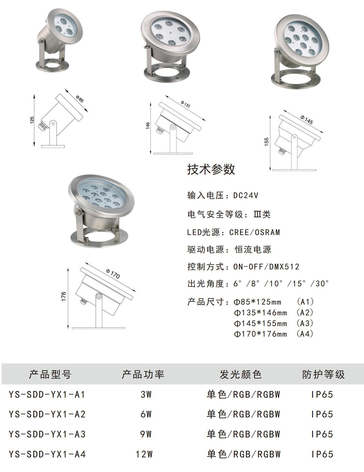 ◆灯具控制方式:单色常亮效果(红、绿、蓝、黄、白、暖白);内控同步RGB七彩变化;外控同步RGB七彩变化:国际标准DMX512协议控制系统;◆护水等级:IP65。