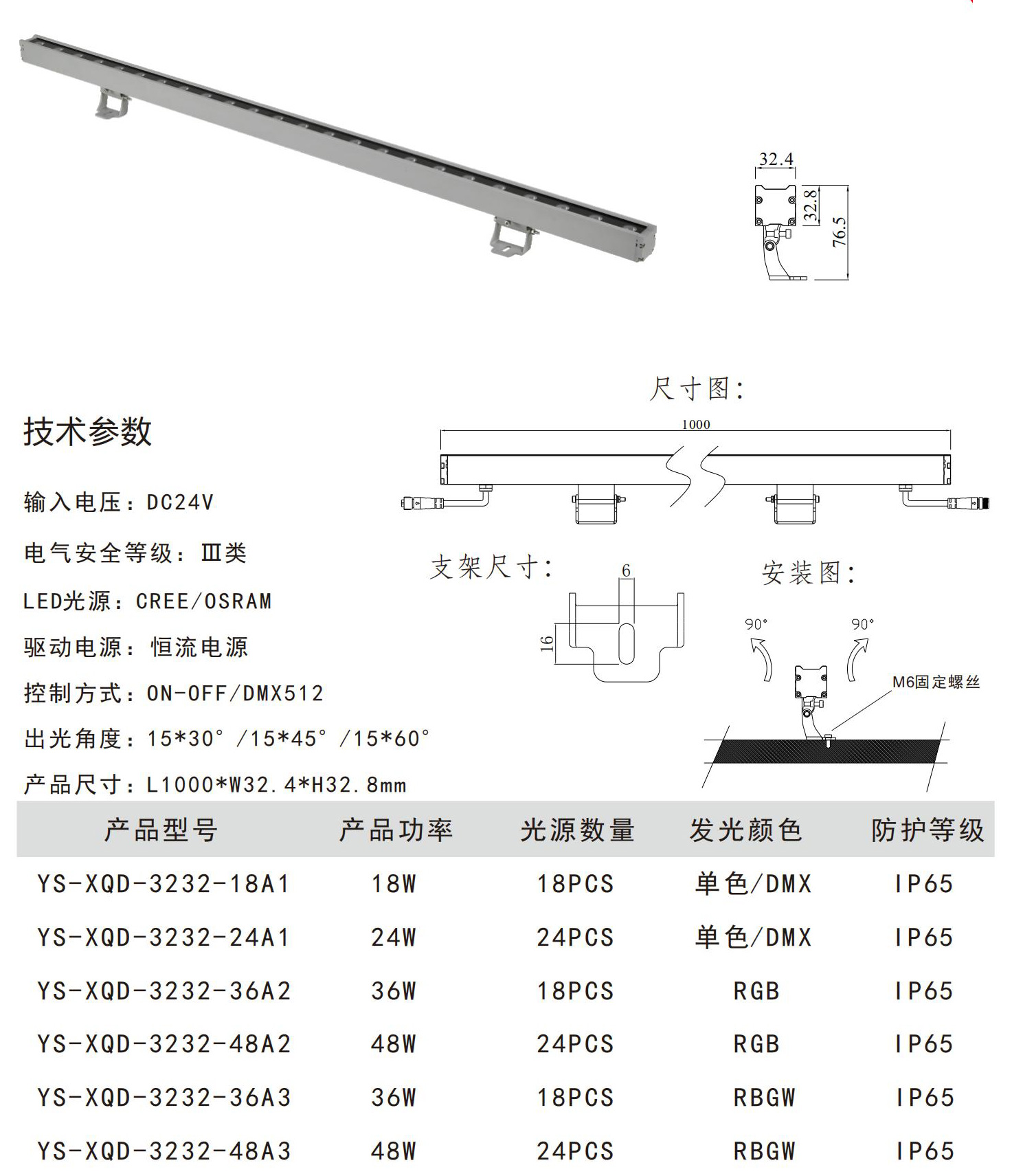 ◆灯具控制方式:单色常亮效果(红、绿、蓝、黄、白、暖白);内控同步RGB七彩变化;外控同步RGB七彩变化:国际标准DMX512协议控制系统;◆护水等级:IP65。