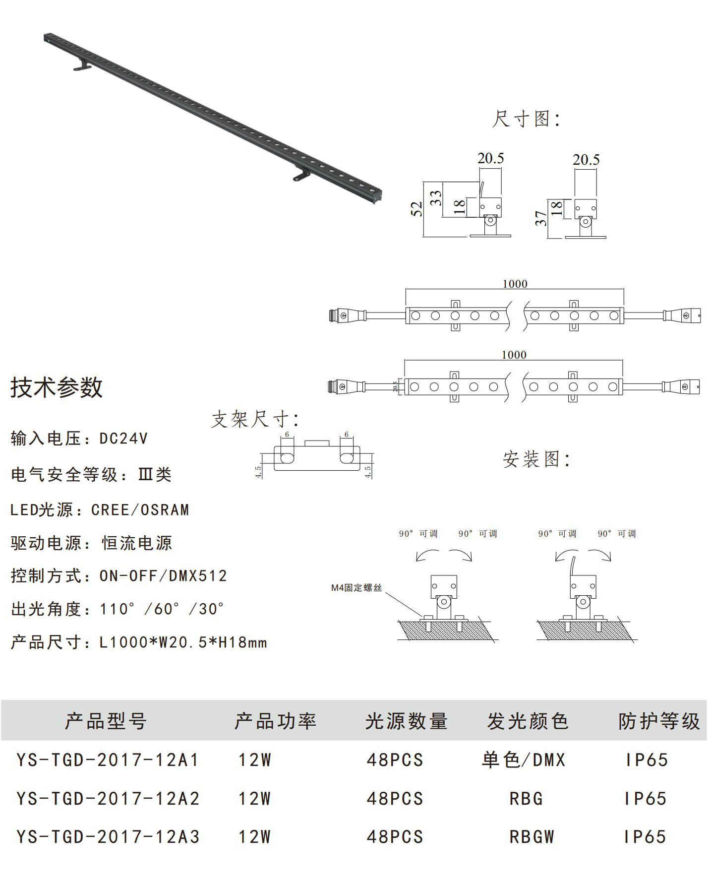 ◆灯具控制方式:单色常亮效果(红、绿、蓝、黄、白、暖白);内控同步RGB七彩变化;外控同步RGB七彩变化:国际标准DMX512协议控制系统;◆护水等级:IP65。